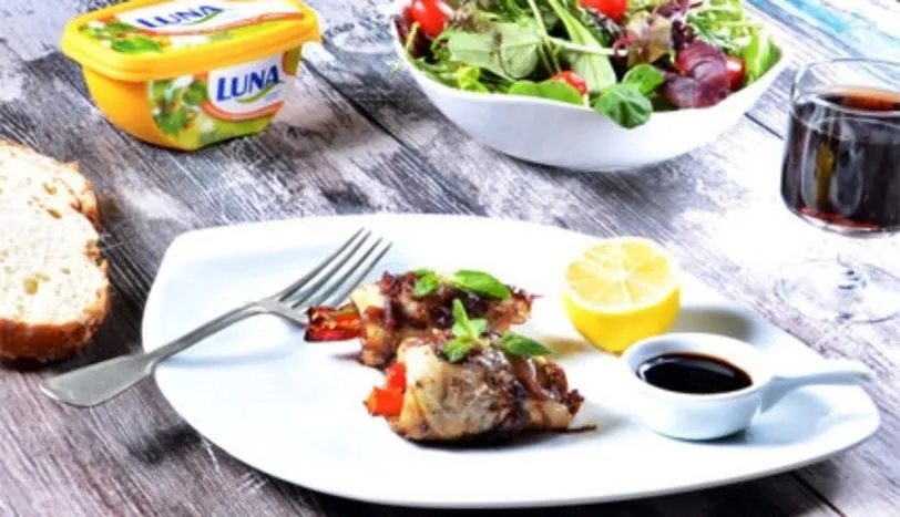 Levrek filetolarına tuz ve karabiber serpip kenara alın. Şeritler halinde kestiğiniz levreklerin içerisine sebzeleri yerleştirerek sarın ve bir kürdan yardımıyla ek yerinden tutturun. Luna'yı yapışmaz yüzeyli bir tavada eritin ve yağ hafifçe kızdıktan sonra sardığınız levrekleri içerisinde çevirerek kızartın. Balıklar kızarınca yağın içerisinden balıkları kenara alıp aynı tavada piyazlık doğradığınız soğanları kavurun. Soğanlar kavrulduktan sonra balıkları tekrar tavaya alın ve soya sosunu ilave ederek kısık ateşte sosu çekene kadar pişirin. Sıcak olarak servis yapın.