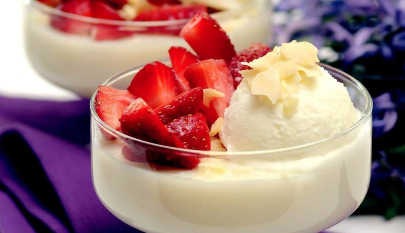 Üzerine dilimlenmiş çilek ve dondurma yerleştirin. File bademle süsleyip servis yapın.