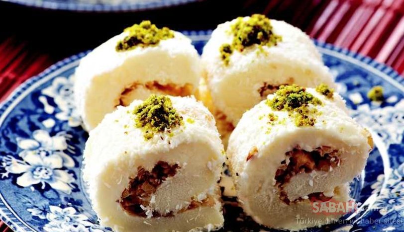 Rulo yapıp, antep fıstığı ile süsleyin. Kalan muhallebiyi de aynı şekilde hazırlayın. Soğuk servis yapın.