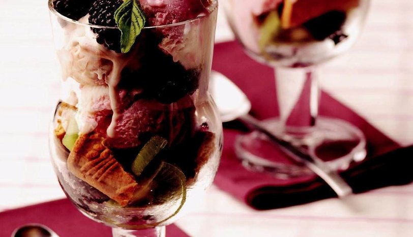 Bisküvileri parçalayıp, bir kısmını kuplara pay edin. Üzerlerine 2-3 adet böğürtlen serpiştirin. İki kupa da 1'er top dondurma yerleştirin. Kalan bisküvi, böğürtlen ve kiviyi de yerleştirip, üzerlerine dondurma koyun. Soğuk olarak servis yapın.