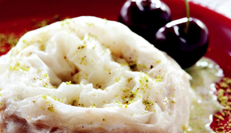 Diğer güllaç yapraklarını da aynı şekilde hazırlayın ve artan sütü üzerlerine gezdirin. Toz antep fıstığı ve kiraz ile süsleyerek, servis yapın. - 2