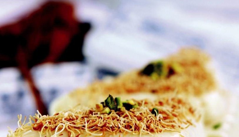 Ayrı bir yerde soğuk süt, un, kalan toz şeker, yumurta, rendelenmiş limon kabuğu ve 1 su bardağı ufalanmış kadayıfı koyu bir muhallebi kıvamı alana dek pişirin. Tereyağını ekleyip, karışım sıcakken 10 dakika mikserle çırpın.