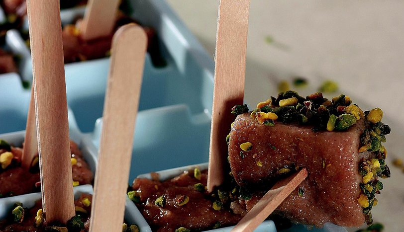 Biraz ılındıktan sonra buz kalıplarına dökün. Her bir parçaya bir adet dondurma çubuğu batırın. Buzlukta dondurun.