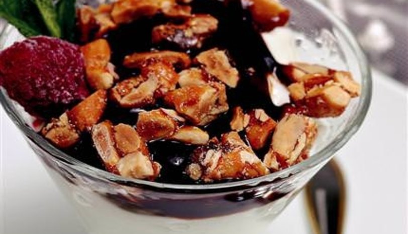 Karamel sosu muhallebinin üzerine gezdirin. En üste kırılmış krokanlar serpip servis yapın