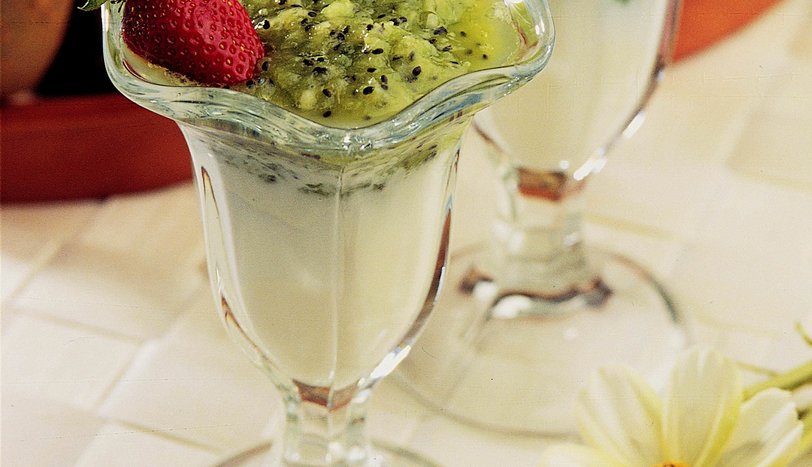 Kivileri soyup dilimleyin ve kalan pudra şekeri ile birlikte blenderden geçirin. Kivi püresini kupların üzerine paylaştırın. Buzdolabında 1-2 saat bekletin. Çilekle süsleyerek servis yapın.