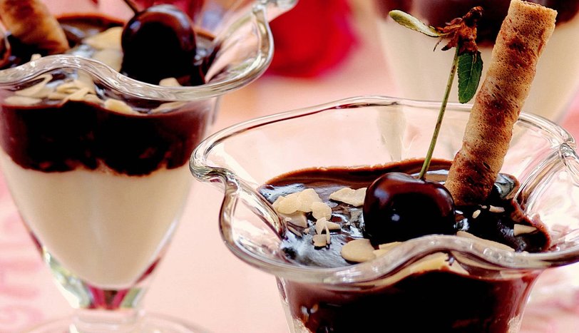 Üzerlerine ufalanmış kedi dillerini ve dövülmüş fındık serpin. Diğer tarafta çikolatalı sos için bir tencerede süt, su, kakao, toz şeker ve nişastayı karıştırarak pişirin. Kaynayınca içine damla çikolatayı ilave edip karıştırın. Çikolatalı sosu kuplara paylaştırın. Buzdolabında 1-2 saat bekletin. Soğuk olarak servis yapın.