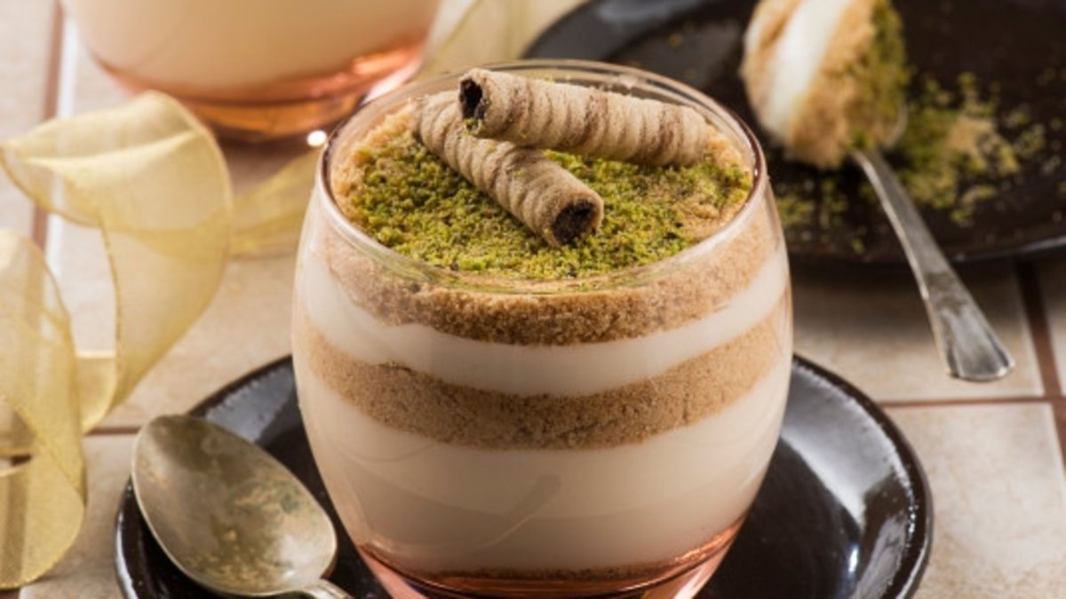 Kalan muhallebi ve bisküvi tozunu ince katman olacak şekilde kat kat kuplara pay edip, Antep fıstığı serpin. Dilediğiniz şekilde süsleyin ve soğuk olarak servis yapın.