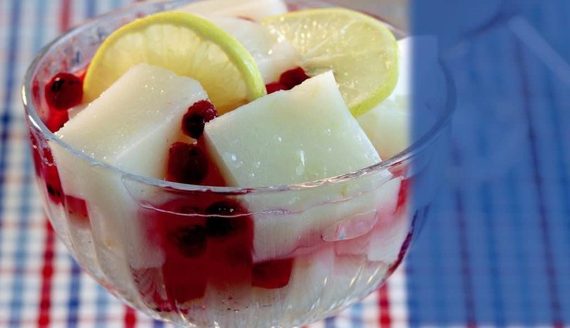 Daha sonra iri küpler halinde kesin. Buzdolabında 30 dakika dinlendirin. Üzeri için, toz şeker, su ve limon suyunu, toz şeker eriyene kadar iyice karıştırın. Buzdolabından çıkardığınız muhallebinin üzerine dökün. Kuplara alıp, limon dilimleri ve frenk üzümü ile süsleyerek servis yapın.