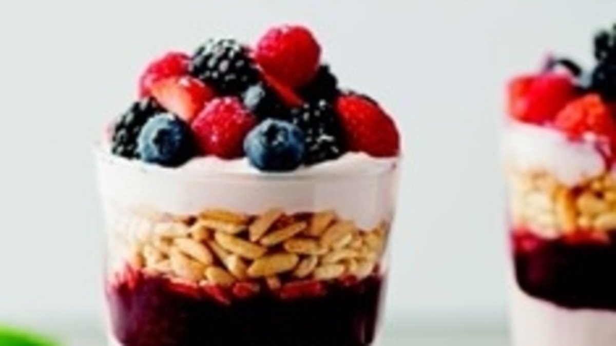 Meyveleri bir blender veya mutfak robotunda püre haline getirin. Servis bardaklarının tabanına bir kat muhallebi koyun. Üzerine bir kat meyve püresi ekleyin. Meyve püresinin üzerine pirinç kraker koyun. Tekrar bir kat muhallebi ekleyin. Taze meyveler ile süsleyerek servis yapın.