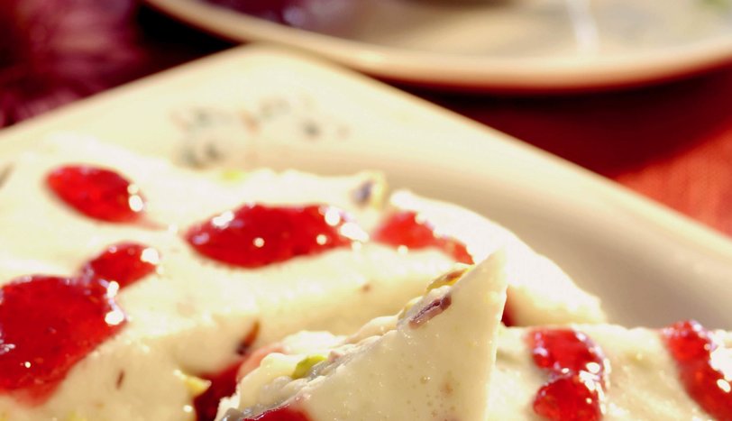 Buzdolabında 5-6 saat beklettikten sonra dilimleyip ahududu marmeladı ile birlikte servis yapın.