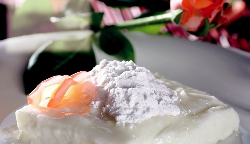 Muhallebi iyice soğuyunca kare şeklinde kesip tabaklara alın. Üzerine gül suyunu gezdirin. Üzerine kaymak parçaları koyup pudra şekeri serperek servis yapın.