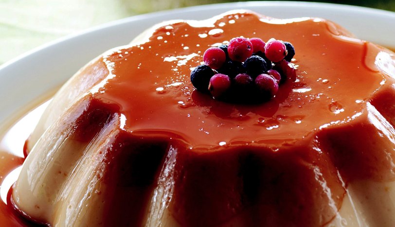 Şöyle bir karıştırdıktan sonra tencereyi ocaktan alın ve karamelin üzerine boşaltın. Bu şekilde oda sıcaklığında soğutun. Daha sonra buzdolabına alıp, donması için 1 gece bekletin. Servis yapmadan önce krem karamelli kabı, sıcak su dolu bir kabın içine oturtun (karamelli kabın içine su girmemesine dikkat edin). Dibindeki karamel iyice eridikten sonra kabı sallayıp, servis tabağına ters çevirip, çıkarın. Üzerini dondurulmuş yaban mersini ve frenk üzümü ile süsleyerek servis yapın.
