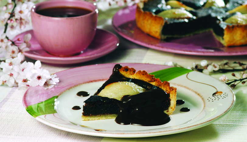Oda sıcaklığındaki margarin, un, tuz ve suyu karıştırarak hazırladığınız hamuru 15 dakika dinlendirdikten sonra yağlanmış tart kalıbına yayın. Toz şeker, kakao, toz badem, oda sıcaklığındaki margarin, badem esansı ve yumurta sarılarını karıştırarak tartın iç malzemesini hazırlayın. Ayrı bir kapta yumurta beyazlarını bir mikserle çırparak köpük kıvamına getirin. iç malzemenin içine en son köpük kıvamına getirdiğiniz yumurta aklarını katın ve karıştırın. Hamurun üstüne, hazırladığınız içi bir kaşık yardımıyla yayın. Armutları soyup, çekirdeklerini çıkarın, dörde bölün. 2 çorba kaşığı toz şeker ve oda sıcaklığında beklemiş 2 çorba kaşığı tereyağını çırpın. Armut dilimlerini bu bulamaca batırın ve tartın üzerine daire olacak şekilde yerleştirin. Önceden ısıtılmış 200 derece fırında 40 dakika pişirin. Bir tencereye kremayı koyup ocağa oturtun. Çikolatayı parçalara ayırıp kremaya ekleyin ve eriyene dek karıştırın. Tartı, bu kremayla servis yapın.