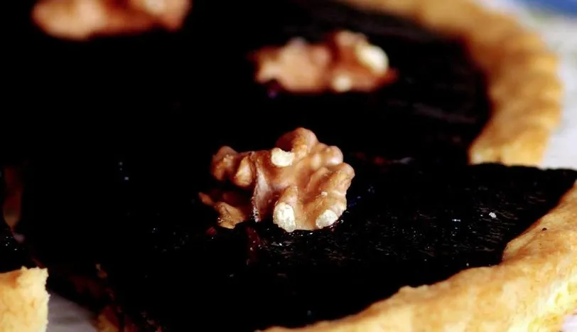 Un, tereyağı, pudra şekeri ve tuzu iyice yoğurun. Yağlanmış 18 cm çapındaki fırın kabına dökün. Buzdolabında 1 saat dinlendirin. Önceden ısıtılmış 180 derece fırında, üzeri pembeleşene dek pişirin. Fırından alıp, soğumaya bırakın. Üzeri için çikolatayı benmari usulü eritin. Ocaktan alıp,kremayı, ardından yumurtayı ve cevizi ekleyin. İyice çırpıp tart hamurunun üzerine dökün. Tekrar, 180 derece fırında kontrol ederek pişirin. Ilık veya soğuk servis yapın.