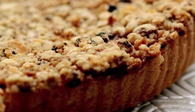 Öncelikle hamuru hazırlayın. Bunun için tüm hamur malzemesini yoğurun. Kulak memesi kıvamında bir hamur elde edin. Hamurdan küçük bir parça koparıp, buzluğa koyun. Kalan hamuru tart kalıbı büyüklüğünde açın. Yağlanmış kalıba hamuru yayın. Kenarlarını düzeltin. Üzerine alüminyum folyo serip, nohut serpin. Önceden ısıtılmış 180 derece fırında tartı pişirin. Pişen tartı fırından alıp, üzerinden folyoyu ve nohutu çıkarın. Rendelenmiş elmaya şekeri ekleyin ve ocağa alıp, birkaç dakika pişirin. Tarçın ve cevizi ilave edin. Elmalı harcı tartın üzerine yayın. Buzluktan aldığınız hamuru da tartın üzerine rendeleyin. Tekrar fırına verip, üzeri kızarana dek pişirin. Ilınınca, dilimleyerek servis yapın