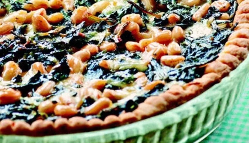 HAMUR için un, yoğurt, tereyağı, kabartma tozu ve tuzu çok fazla yoğurmadan hamur elde edin. İnce şekilde açıp, yağlanmış yuvarlak tart kalıbına yerleştirin. Önceden ısıtılmış 180 derece fırında 10-15 dakika pişirin. İç harcı için yemeklik doğranmış soğanı sıvı yağda hafif soteleyin. Yıkanıp kıyılmış ıspanağı ekleyip sotelemeye devam edin. Ocaktan alıp, kuru fasulye, muskat, karabiber, pul biber ve tuz ekleyip karıştırın. Kaşar peyniri, beyaz peynir ve yumurta ilave edip karıştırmaya devam edin. Karışımı tart hamurunun üzerine yayın. Yeniden fırına verip, önceden ısıtılmış 180 derece fırında, hamur iyice kızarana dek pişirin. Dilimleyip servis yapın.