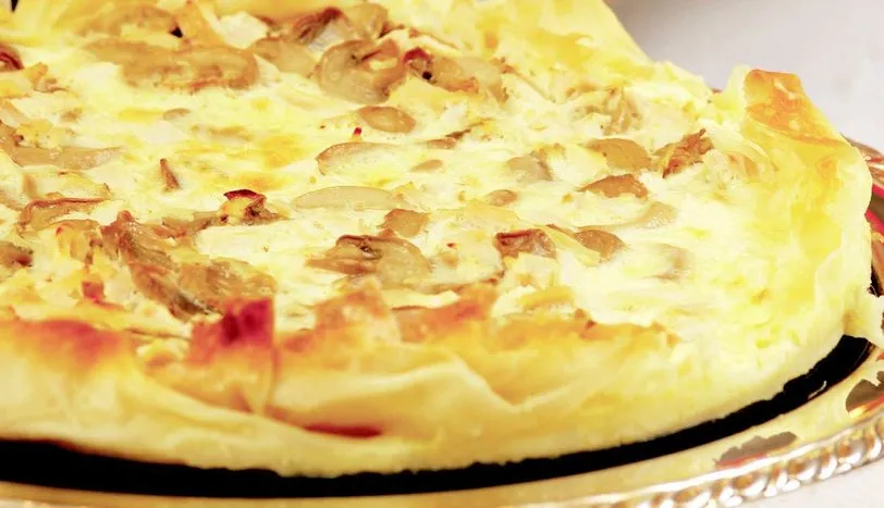 Tavada bir buçuk çorba kaşığı tereyağını eritip, soğanları pembeleştirin ve mantarları ekleyip, suyunu çekene kadar pişirin. Daha sonra tavadan alıp, tavuk ve yumurtayı ekleyin. Baka bir kapta krema ve sütü karıtırıp mantar karıımına ekleyin. 3 adet yufkayı, aralarına sıvı yağ sürerek, yuvarlak bir kalıba yerleştirin.Üzerine kremalı malzemeyi dökün. 200 derece fırında, üzeri kızarana dek pişirin.