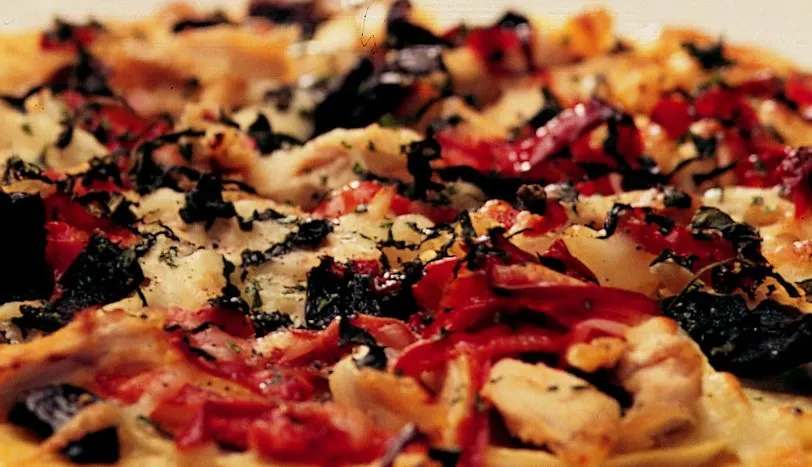 Mutfak robotuna unu, şekeri ve bir tutam tuzu aktarın. 6 çorba kaşığı soğuk tereyağını ilave edin. 2-3 dakika çevirin. Robotun kapağını açarak, 1 çorba kaşığı çok soğuk su ekleyin. Tekrar robottan geçirin. Hamur tamamen özleşip, toplanırsa su ekleyin. Hamur toplanmadıysa 1-2 çorba kaşığı daha çok soğuk su ilave edin. Hamuru streç filme sararak, yarım saat buzdolabında bekletin. Streç filmden çıkarıp, pizza hamuru kalınlığında açın. Üzerine yağlı kağıt yayılmış fırın tepsisine aktarın. Hamurun kenarlarına yumurta sarısı sürün. Üzerine ince kıyılmış soğanı yayıp, tuz ve karabiber serpin. Önceden ısıtılmış 200 derece fırında 15 dakika pişirin. Fırından çıkarıp, üzerine haşlanmış tavuk etini, ince kıyılmış kırmızı biberleri, çekirdekleri çıkarılmış zeytinleri, kaşar peynirini ve ince kıyılmış fesleğeni yayın. Aynı ısıdaki fırında 20 dakika daha pişirin. Sıcak servis yapın.