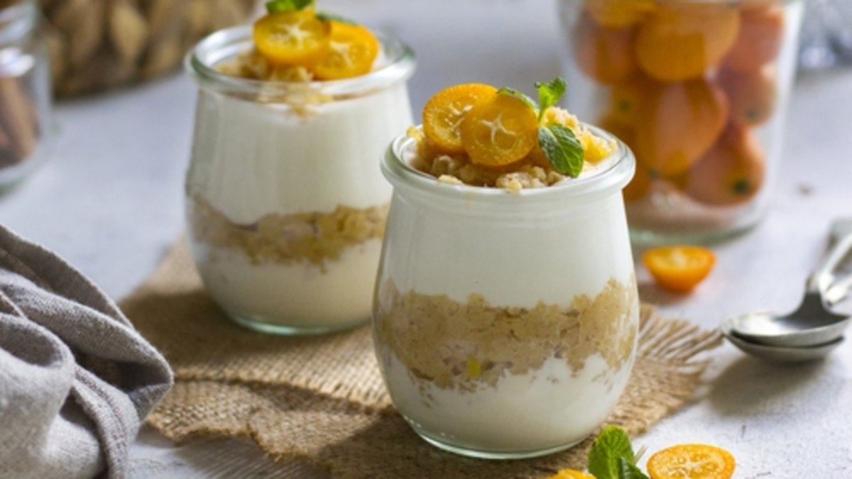 Daha sonra cheesecake katmanı ve ayvalı karışımı dönüşümlü olarak servis bardaklarına pay edin. Üzerlerini kumkuat ile süsleyip servis yapın.