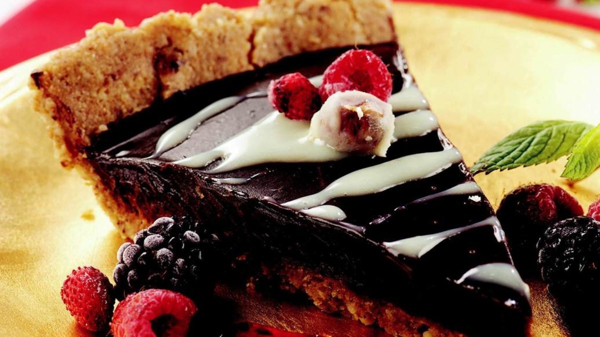 Yulaflı bisküvileri robottan geçirin. Üzerine dövülmüş fındık, tereyağı ve toz tarçını ekleyip tekrar robottan geçirin. Karışımı 20 cm çapında, pişirme kağıdı ile kaplanmış bir kalıba bastırarak yayın. Buzdolabında yarım saat dinlenmeye bırakın.300 ml krema ve bitter çikolatayı benmari usulü eritip iyice karıştırın ve vanilya ekstratını ekleyin. Oda sıcaklığında 10 dakika bekleterek kıvam almasını sağlayın. Daha sonra buzdolabında beklettiğiniz tabanın üzerine yayın ve tekrar buzdolabında en az 6-8 saat bekletin.Sosu için beyaz çikolata ile kremayı benmari usulü eritin ve soğutup tartın üzerine gezdirin. Üzeri için pudra şekerini suyla birlikte bir kaba alın ve ocağa oturtun. Karamelize olmaya başladığında çikolatayı ekleyin. Sıvı bir karışım haline geldiğinde fındıkları ekleyip iyice karışıma bulanmalarını sağlayın. Fındıkları pişirme kağıdının üzerine alın ve sertleşmelerini bekleyin. Tartın üzerine yayın ve dilimleyerek servis yapın.