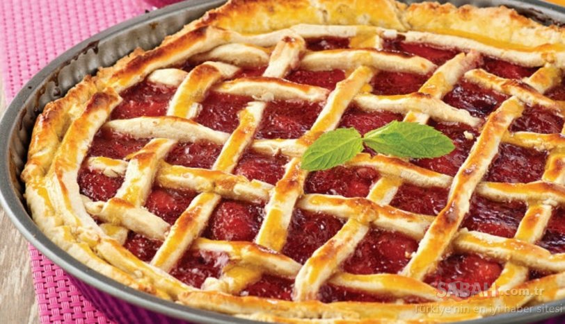 Üzerine soğuyan çilekli dolguyu boşaltın. Ayırdığınız hamuru açın ve uzun şeritler halinde kesip, turtanın üzerine kafes şeklinde yerleştirin.