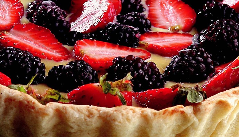 Kısık ateşte, karıştırarak koyulaşana kadar pişirin. Karıştırarak soğutun. Tartı, servis tabağına çıkartın. Soğuyan kremayı tartın içine yayın. Üzerine çilek ve böğürtlenleri dizin. Dilimleyerek servis yapın. - 2