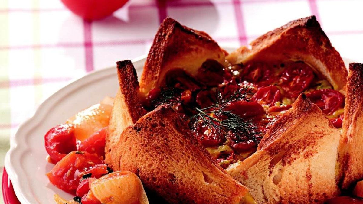 Ekmek dilimlerinin kenarlarını keserek alın. Kiraz domatesleri ikiye bölün. İçini hazırlamak için kabakları rendeleyip geniş bir kaba alın. Üzerine beyaz peynir, yumurta, dereotu, muskat, zeytinyağı, tuz ve karabiber ekleyip karıştırın. Çok büyük olmayan yuvarlak ve derin bir fırın kabını tereyağı ile yağlayın. Kabın dibini ekmekle kapatın. Kalan dilimleri kabın kenarlarına balık sırtı şeklinde dizin. Hazırladığınız harcın yarısını kaba dökün. Üzerine ikiye bölünmüş kiraz domateslerin yarısını dizip, kabaklı harcın kalanını koyun. Kalan domatesleri üzerine yerleştin. Önceden ısıtılmış 180 derece fırında 45 dakika pişirin. Dilimleyerek servis yapın.