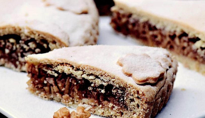 Harç için rendelenmiş elma, ceviz, toz şeker ve tarçını harmanlayıp, hamurun üzerine yayın. İkinci kat hamuru yerleştirin ve üzerine çatalla delikler açın. Önceden ısıtılmış 170 derece fırında, 35-40 dakika pişirin. Ilındıktan sonra pudra şekeri serpip servis yapın.