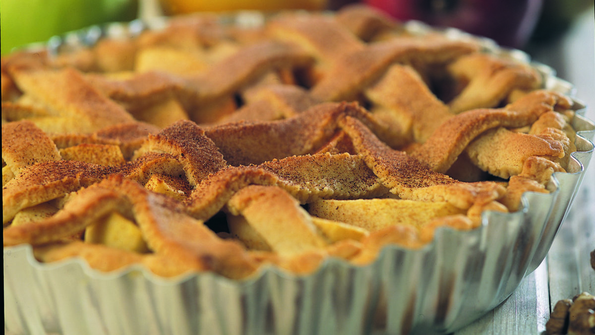 HAMURU yapmak için un, oda sıcaklığındaki margarin, yumurta ve suyu karıştırıp yoğurun. Hamurun 1/3'ünü kenara ayırın. Diğer parçayı merdaneyle 20-22 cm çapında tart kalıbının dibini ve kenarlarını kaplayacak şekilde açın. Kalıbı yağlayın ve hamuru yerleştirin. Hamuru çatalla birkaç yerinden delin. Tartın dip kısmını tamamen kaplayacak başka bir ısıya dayanıklı kabı hamurun üzerine yerleştirin. Önceden ısıtılmış 180 derece fırında hamur pembeleşene kadar pişirin. Elmaları soyup çekirdek yataklarını çıkarın. incecik dilimleyin. Elmaları dövülmüş ceviz, tarçın ve tozşekerle karıştırıp hamurun üzerine yayın. Kalan hamuru merdaneyle açıp ince şeritler kesin. Bu şeritleri tartın üzerine kafes görüntüsü vermek için enine ve boyuna yerleştirin. Tartı tekrar fırına verip 15 dakika daha pişirin.