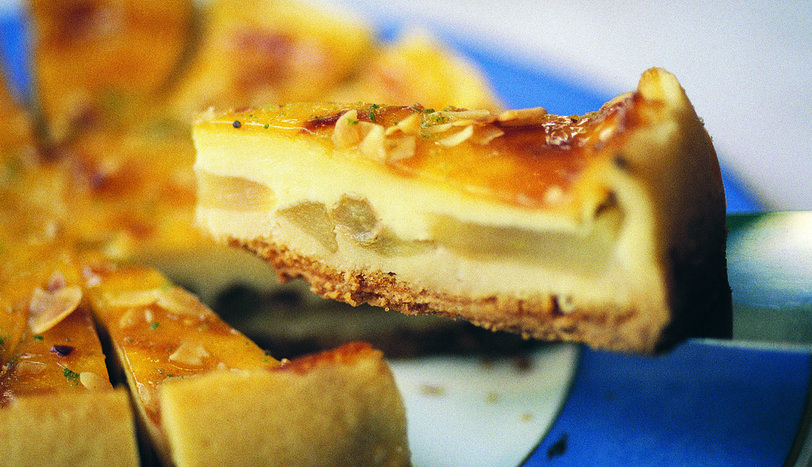 Hamur için gerekli tüm malzemeyi bir kapta karıştırıp, özleşene dek yoğurun. Bir saat buzdolabında bekletin. Pasta kreması için, sütü, kremayı, vanilyayı, tuz ve şekeri bir kapta, kısık ateş üzerinde ısıtın. Yumurtaları ve mısır ununu başka bir kapta çırptıktan sonra kaynamakta olan sütlü karışıma azar azar ve sürekli karıştırarak, ekleyin. Karışım koyulaşana dek kısık ateşte pişirin. Hafifçe ılınana dek, ara sıra karıştırarak bir kenarda bekletin. Önceden hazırladığınız hamuru buzdolabından çıkarıp, oda sıcaklığında 15-20 dakika bekletin. Hamurun çok az bir parçasını ayırıp, kalanını 23 cm çapında ve yarım cm kalınlığında açın. 23 cm çapında ve 5 cm yüksekliğinde yuvarlak bir kalıba döşeyin. Küçük hamur parçasını da yarım cm kalınlığında açtıktan sonra 3 cm eninde şeritler kesin. Kalıbın kenarlarını bu şeritlerle kaplayın. Elmaların kabuğunu soyduktan sonra her birini 8 dilime ayırın. Hamurun üzerine dizin. Pasta kremasını elma dilimlerinin üzerine dökün. Önceden ısıtılmış 180 derece fırında kremanın üzeri hafifçe kızarana dek pişirin. Turtayı fırından çıkarıp, ızgara telinin üzerine koyup, ılınmasını bekleyin. Servis yapın.