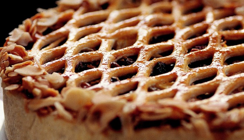 Hamuru hazırlamak için un, su ve oda sıcaklığında beklemiş margarini yoğurup bir hamur elde edin. Hamurun 2/3'ünü merdaneyle açıp kalıbınızın büyüklüğünde açın. Açtığınız hamuru önceden yağlanmış kalıbın tabanına ve kenarlarına yerleştirin. İçi için elmaları küp doğrayın. Elmaların üzerine toz şeker ve limon suyu ilave ederek karıştırın. Kalan malzemeleri de ilave edip kalıptaki hamurun içine doldurun. Artan hamuru da merdaneyle açın. Bıçakla, hamurun bütünlüğünü bozmayacak biçimde baklava desenleri çıkartın. Hamur ile kalıbın üzerini örtün. Üzerine yumurta sarısı sürün ve kenarlarını ince doğranmış badem ile süsleyin. Önceden ısıtılmış 180 derece fırında yaklaşık 50 dakika pişirin. Dilimleyerek servis yapın.