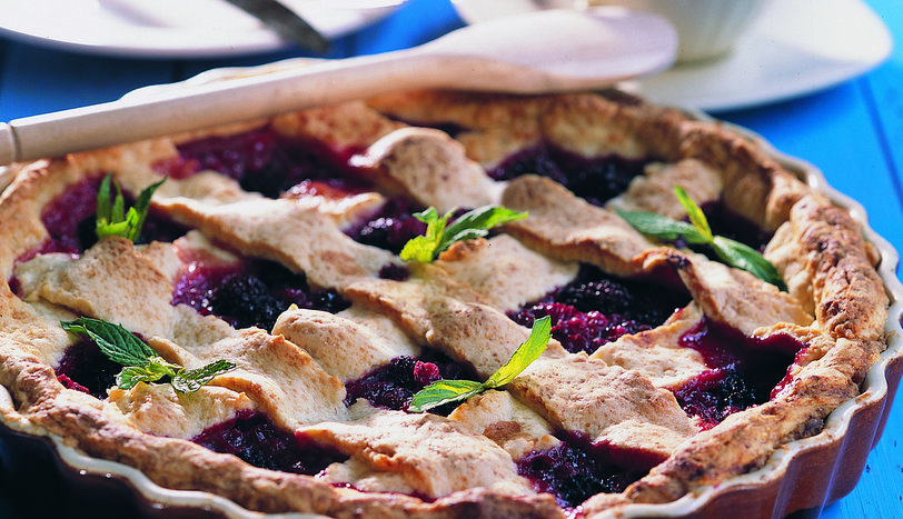 Frenk üzümü ve böğürtleni bir kaba alıp üzerine likörü gezdirin. Beklemeye alın. Diğer tarafta un, toz şeker, tereyağı ve tuzu karıştırın. Duruma göre soğuk su ekleyerek tart hamuru haline getirin. Hamurun 1/4'ünü bir kenara ayırın. Kalan hamuru unlanmış zeminde merdaneyle açın. 22 cm çaplı tart kalıbını yağlayıp hamuru içine yerleştirip kenarlarını yükseltin. 2-3 dakika önceden ısıtılmış 180 derece fırında rengi değişene kadar pişirin. Fırından çıkartıp likör içinde bekleyen meyveleri tartın ortasına yerleştirin. Likörlü sudan 1-2 kaşık meyvelerin üzerine gezdirin. Yarım su bardağı toz şekeri serpin. Ayırdığınız hamuru merdaneyle açıp şeritler halinde kesin. Tartın üzerine kafes şeklinde yerleştirin. Tekrar fırına verip altın sarısı renk alana kadar pişirin.