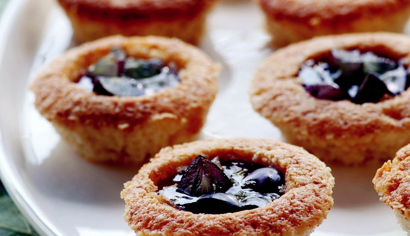Jöle için ikiye bölünmüş 10-12 adet üzüm, toz şeker ve damla sakızını pişirin. Tel süzgeçten geçirip jöle kıvamı alana kadar tekrar pişirin. Jöle ılındığında kalan üzümleri ikiye bölüp karıştırın. Jöleyi şapkaların ortalarına pay edin. Pudra şekeri serpip servis yapın.
