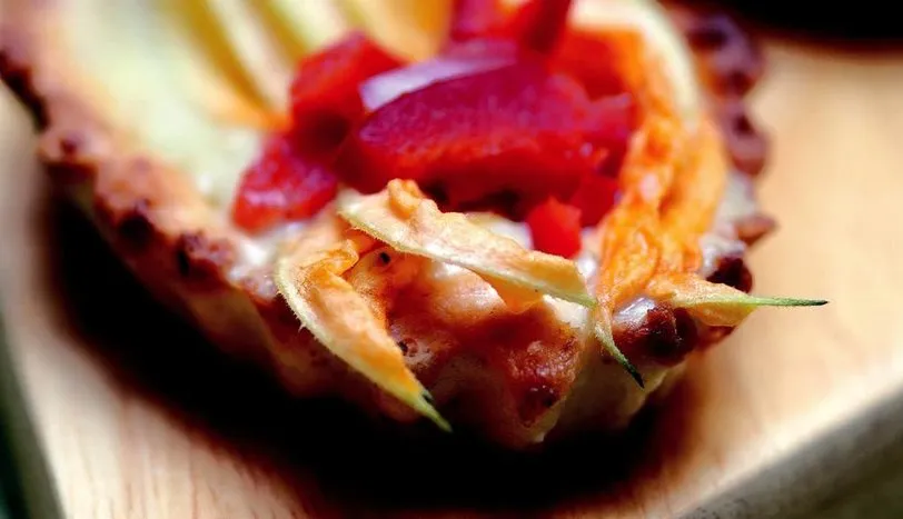 Tereyağı, yoğurt, un ve maydanozu iyice yoğurun. Hamuru streç filme sarıp yarım saat dinlendirin. Beşamel sos için tereyağını tavaya alıp eritin. Unu ilave edip, kısık ateşte karıştırarak kavurun. Ateşten alıp 5 dakika dinlendirin. Çırparak kaynar sütü ilave edin. Orta ısılı ateşte karıştırarak bir taşım kaynatın. Ocağın altını kısıp, arada karıştırarak 10 dakika pişirin. Tuz, karabiber, dereotu ve rendelenmiş rokfor peyniri ekleyip karıştırın ve kenara alın. Hazırladığınız hamuru merdane ile açıp tek kişilik tart kalıplarına yerleştirin. Üzerlerine peynirli beşamel sosu pay edin. Önceden ısıtılmış 170 derece fırında 20 dakika pişirin. Tartöletleri fırından çıkarmaya yakın, üzerlerine kabak çiçeklerini yerleştirin. Fırında 1-2 dakika bekletip çıkarın. Sıcak olarak servis yapın.
