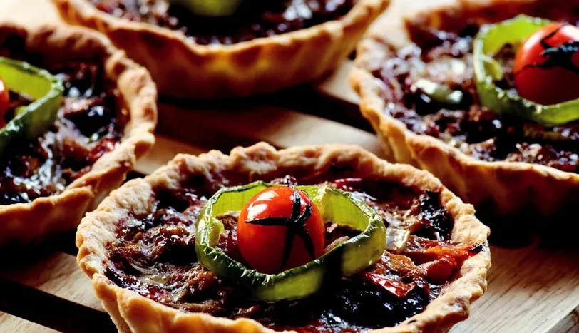 Yoğurma kabına margarin, tereyağı, su, tuz, kabartma tozu ve unu alıp, yoğurun. Hamuru streç filme sarın ve yarım saat buzdolabında dinlendirin. Dinlenen hamurdan ceviz büyüklüğünde parçalar koparın. Merdane ile ince olacak biçimde açın ve küçük tart kalıplarının içine kenarları da kaplayacak şekilde yerleştirin. İçi için kıyma, rendelenmiş soğan, kabuğu soyulup, küp doğranmış domates, kıyılmış kırmızı ve sivri biber, salça, tuz, karabiber ve pul biberi derin bir kapta yoğurun. İç harcı tart kalıplarına paylaştırın. Kişleri bir fırın tepsisine yerleştirin ve önceden ısıtılmış 200 derece fırında 25-30 dakika pişirin. Hafif ılındıktan sonra kalıptan çıkarın ve servis yapın.