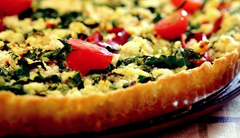 Hamur için margarin, un, yoğurt ve kabartma tozunu yoğurun. Orta büyüklükte bir tart kalıbının içine kenarlarını kaplayacak şekilde yayın. İçi için bir kasede lor peyniri, dörde bölünmüş kiraz domates, ince kıyılmış sivri biber, maydanoz, dereotu ve nane ile taze soğanı karıştırın. Hamurun üzerine yayın. Bir kapta yumurta ve sütü çırpın. Karışımın her tarafına gelecek şekilde dökün. Önceden ısıtılmış 175 derece fırında hamur kızarana kadar pişirin. Ilınınca dilimleyerek servis yapın.