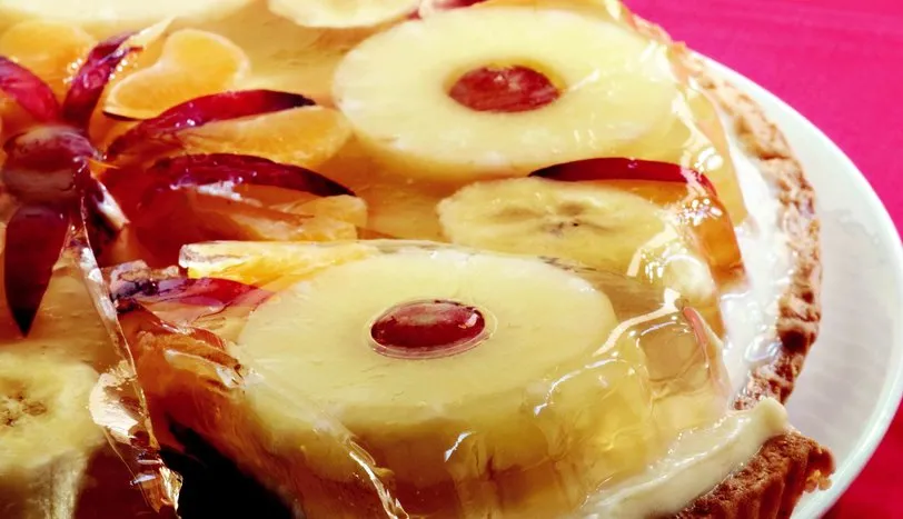 Hamur için tereyağı, toz şeker, krema ve kabartma tozunu derin bir kaba alın. Kulak memesi yumuşaklığında bir hamur elde edene kadar un ilave edip, pütür kalmayacak şekilde yoğurun. Hamuru streç filme sarın ve yarım saat dinlendirdikten sonra merdane ile açın. 30 cm çapında yuvarlak bir tart kalıbının içine kenarları da kaplayacak şekilde yerleştirin. Önceden ısıtılmış 190 derece fırında üzeri hafif pembeleşene kadar pişirin ve ılındıktan sonra kalıptan çıkarın. Krema için süt, un ve toz şekeri bir tencereye alıp, sürekli karıştırarak koyulaşana kadar pişirin. Ocaktan almaya yakın tereyağı, krema, vanilya ve dövülmüş damla sakızı ilave edip, birkaç dakika daha pişirdikten sonra tencereyi ocaktan alın. Soğuduktan sonra pişen tart hamurunun üzerine kremayı yayın. Jöleyi 5 su bardağı kaynar suyun içinde karıştırarak eritin. Ananas ve elmayı arzu ettiğiniz gibi dilimleyin. Tart üstü kadar bir kalıbı su ile ıslatın ve muzlu jöleden 1 su bardağı dökün. İçine meyveleri dilediğiniz biçimde dizin. Kalan jöleyi üzerine boşaltınve buzdolabında 2 saat dinlendirin. Tart kalıbı büyüklüğündeki bir tabak yardımıyla meyveli jöleyi ters çevirinve kremalı tartın üzerine yerleştirin. Dilimleyerek, servis yapın.