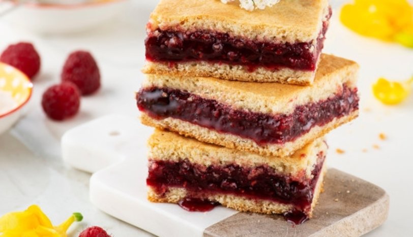 Hamuru iki eşit parçaya ayırıp yassılaştırın. Streç film ile kaplayarak buzdolabında 30 dakika dinlendirin. 22x22 cm'lik kare tart kalıbına 1 tatlı kaşığı tereyağı sürün ve bir parça hamuru pişirme kağıdı üzerinde ve merdane yardımı ile kalıbın genişliğinden 3-4 cm daha büyük olacak şekilde açın. Sonra kalıba yerleştirip kenarlarını yükseltin. Meyveli harcı hamurun üzerine yayın.