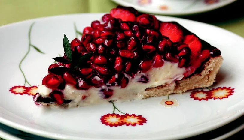 Un, tuz ve tereyağını hafifçe yoğurun. Ekmek kırıntısı görünümü almaya başladığında soğuk suyu ekleyerek ele yapışmayan bir hamur elde edene dek yoğurun. Hamurun üzerine bir bez örterek 15-20 dakika buzdolabında dinlendirin. Dinlenen hamuru düz bir zeminde hafifçe unlayarak ve merdane yardımıyla açın. Yağladığınız 20-22 cm çapındaki tart kalıbına, kenarlarını da kaplayacak şekilde yerleştirin. Hamurun üzerine yağlı kağıt yerleştirin ve 170 derecede 15 dakika pembeleşene dek pişirin. Pişen hamuru çıkartın ve soğumasını bekleyin. Paket muhallebiyi bir kaseye boşaltın. Üzerine soğuk sütü ilave ederek önce yavaş sonra hızlı şekilde 3 dakika çırpın. Muhallebiyi pişen tart hamurunun içine yayın. Üzerini nar ve arzuya göre çilekle süsleyin.