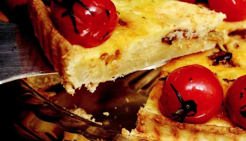 kişin üzerine yayıp, 20 dakika daha pişirin. Üst malzemesi için kiraz domatesleri yapraklarıyla birlikte zeytinyağında hafif soteleyin. Toz şeker, fesleğen ve tuz ilave edip, biraz daha sotelemeye devam edin ve fırından aldığınız kişin üzerine yerleştirin. Dilediğiniz şekilde süsleyip, servis yapın
