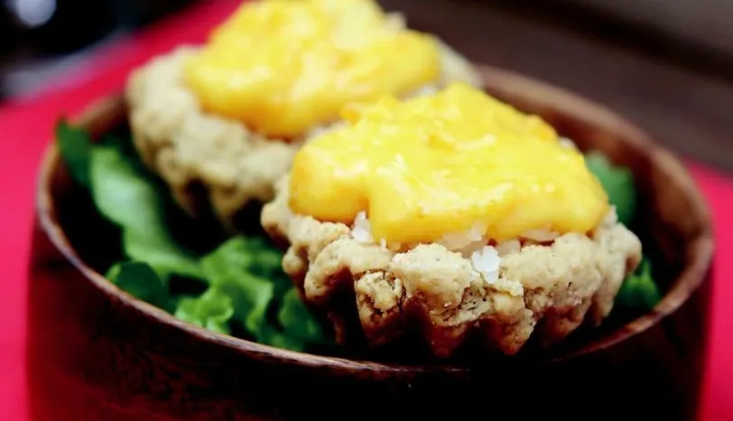 Harç için pirinci tereyağında kavurun. Su, süt ve tuz ilave edin. Pirinç yumuşayana dek pişirin. Dinlendirmek için kenara alın. Hamur için tüm hamur malzemesini karıştırıp, kulak memesi yumuşaklığında bir hamur elde edin. Hamuru yarım cm kalınlığında açıp, su bardağının ağzı ile yuvarlaklar kesin. Tartölet kalıplarına yerleştirin. Önceden ısıtılmış 160 derece fırında üzerleri hafifçe kızarana dek pişirin. Hamuru, tartölet kalıplarından çıkarıp, ortalarına pirinçli karışımı pay edin. Sos için tüm sos malzemesini, krema kıvamı alana dek karıştırın. Krema sıkacağına doldurup, pirinçli karışımın üzerine sıkın. Ilık servis yapın.