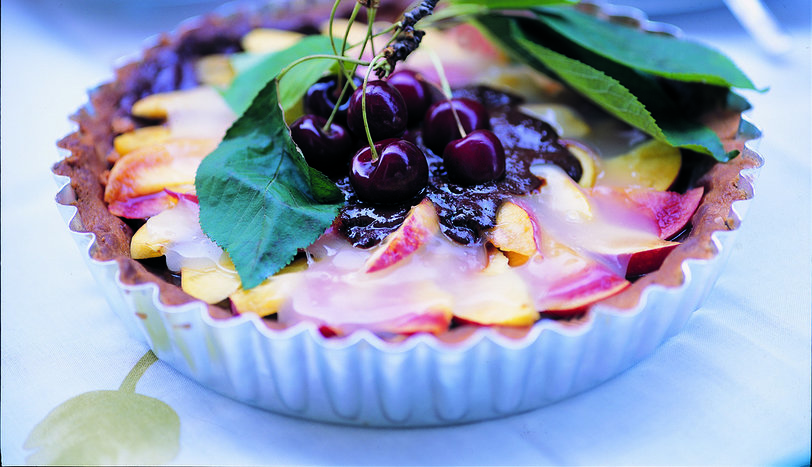 Unu bir kaba eleyip havuz gibi ortasını açın. Küp kesilmiş tereyağı, yumurta, tuz, yarım su bardağı toz şeker, vermut ve 2 çorba kaşığı çikolatalı kremayı una ilave edin. Çok hızlı karıştırın ya da robottan geçirin (yapışkan bir hamur olursa 1-2 çorba kaşığı un eklenebilir). 24 cm çapında bir tart kalıbını yağlayıp unlayın. Hamuru kalıbın dibine ve kenarlarına yayın. Bir buçuk saat buzdolabında bekletin. Hamura çatalla delikler açın. Önceden ısıtılmış 200 derece fırında pişirin. Fırından çıkartıp soğumaya bırakın. Şokellayı, kremayla birlikte benmari usulü eritin ve tartın üzerine yayın. Kalan toz şekeri 3 su bardağı suda kaynatın. Kaynayan şerbete çekirdeği çıkartılıp dilimlenmiş şeftalileri atın. 5 dakika kaynatın. Şeftalileri delikli kepçeyle alıp sularını süzdürün. Tartın üzerine dizin. Tart jölesini 2 çorba kaşığı şekerle karıştırın. 1 çay bardağı su ekleyip kısık ateşte karıştırarak pişirin. Koyulaşınca ocaktan alıp karıştırarak soğutun. Tartın üzerine yayın. Çikolatayı benmari usulü eritip jölenin üzerine dökün. Soğuttuktan sonra servis yapın.