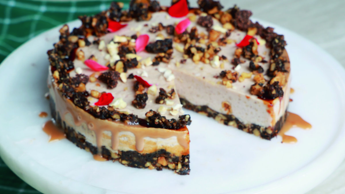 Karamel sos için Hindistan cevizi sütünü ve şekeri tencereye alın. Kısık ateşte kıvamı koyulaşana kadar karıştırarak 30-40 dakika pişirin. Soğuduktan sonra cheesecake'in üzerine gezdirin. Yenilebilir çiçekler, ceviz ve taban hamurundan ayırdığınız kırıntılar ile süsleyerek servis yapın.