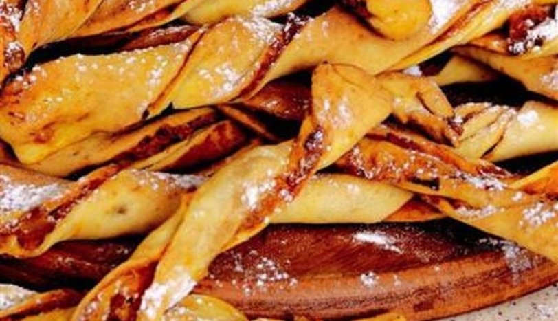 Elinizle şeritlerin iki ucundan tutup, burun. Diğer yufkaya da aynı işlemi uygulayın. Fırın tepsisine aralık kalacak şekilde dizip, önceden ısıtılmış 180 derece fırında, pembeleşene dek pişirin. Pudra şekeri serpip, servis yapın.