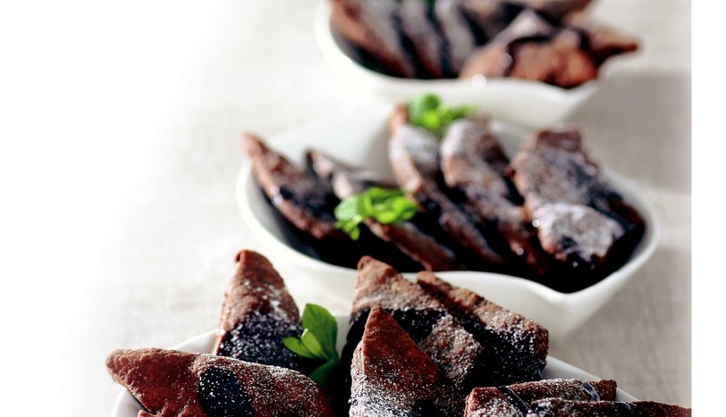 10 dakika dinlendirdikten sonra unlamış tezgahta açın. Baklava dilimi şeklinde kesip, ayçiçek yağında kızartın. Servis tabağına alıp üzerine benmari usulü eritilmiş çikolata gezdirin. Pudra şekeri serperek servis yapın.