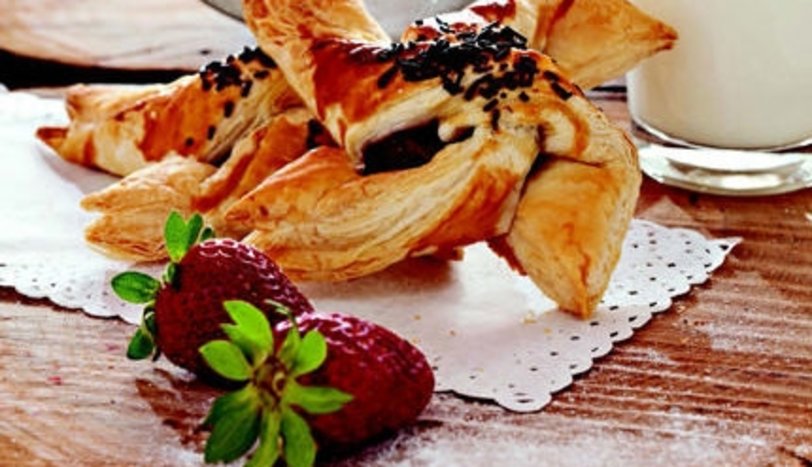 Üzerine çikolatanın yarısını serpiştirip, kesik milföy parçalarını rüzgar gülü olacak şekilde kapatın. Çırpılmış yumurta sarısı sürüp, kalan rendelenmiş çikolatayı serpiştirin.