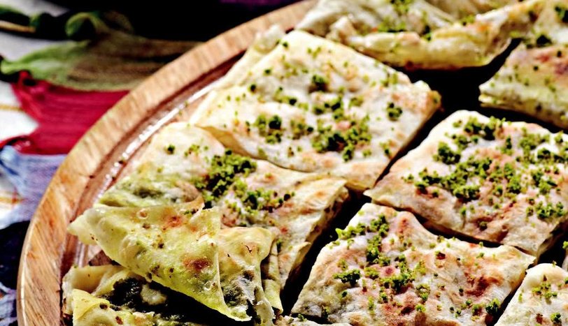 Yufkayı düz bir zemine yayın. Üzerine eritilmiş tereyağı sürüp, toz şeker serpin. Kaymağı küçük parçalara ayırıp, yufkanın üzerine serpiştirin. Antep fıstığı serpip, yufkanın dört ucunu ortada üst üste katlayın ve kare elde edin.