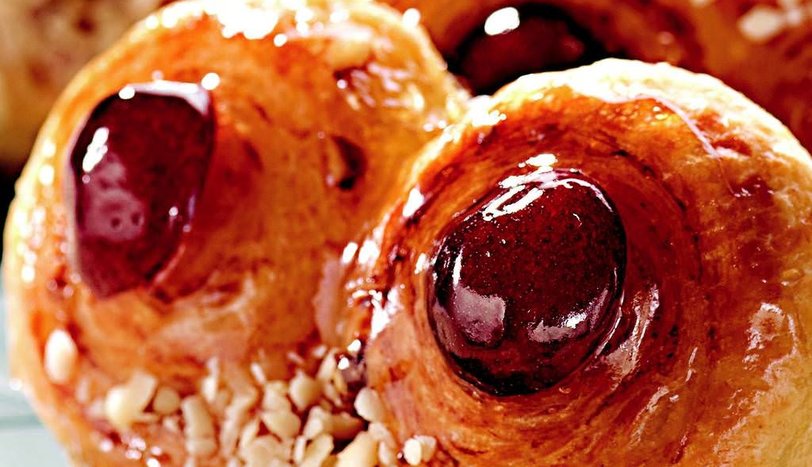 Dinlenen hamuru merdane yardımıyla tezgahın üzerine açın. Üzerine soğuyan kremayı sürün. Hamurun iki tarafından ortaya doğru katlayarak sarın. Dilimleyip, fırın tepsisine yerleştirin. Orta gözlerine kiraz yerleştirip, önceden ısıtılmış 180 derece fırında kontrol ederek pişirin. Üzeri için jelatini suda eritin. Fırça yardımıyla pastacıkların üzerilerine sürün. Jelatin donduktan sonra servis yapın.