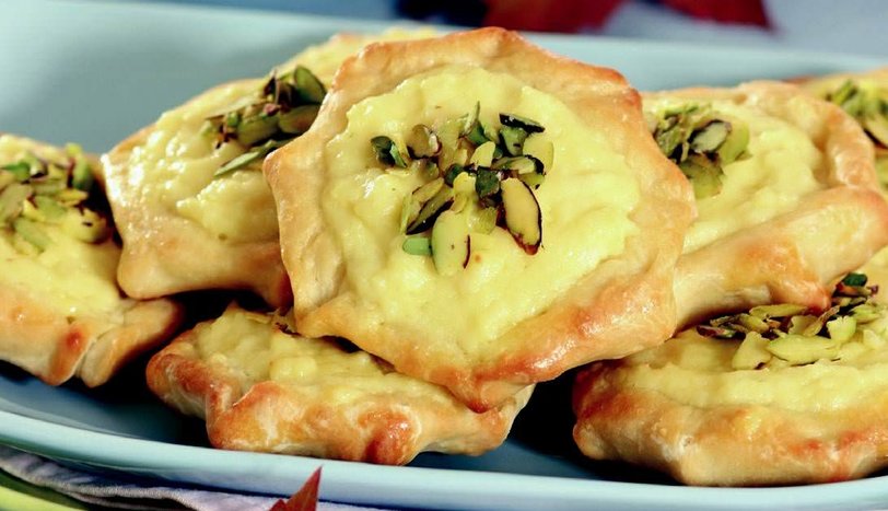 Hamurdan parçalar kopartıp çay tabağı büyüklüğünde ve yarım santim kalınlığında olacak şeklide açın. Kenarlarının 5-6 yerinden hafifçe dışa doğru çekerek çiçek şekline getirin. Ortasına lorlu harçtan koyup yağlanmış fırın tepsisine dizin. Önceden ısıtılmış 170 derece fırında üzeri kızarıncaya kadar pişirin. Kıyılmış Antep fıstığı serpip servis yapın.