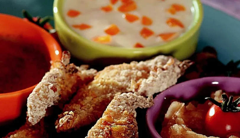 TAVUK göğsünü 2 parmak kalınlığında uzun şeritler halinde doğrayın. Süt, teriyaki sos, tuz ve karabiber karışımında 1 saat bekletin. Galeta ununa bulayıp önceden ısıtılmış 180 derece fırında 10-15 dakika pişirin. Diğer tarafta elma sos için, rendelenmiş elma, şeker ve portakal suyunu kısık ateşte karıştırarak 5 dakika pişirin. Ateşten aldıktan sonra tarçın ilave edin ve kaseye alın. Hardal sos için hardal ve balı iyice karıştırıp, kaseye alın. Kayısılı sos için yoğurt, köri, küp şeklinde doğranmış kırmızı ve sarı biberi karıştırıp, kaseye alın. Soslarla birlikte tavuğu servis yapın.